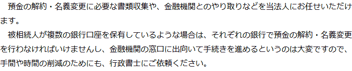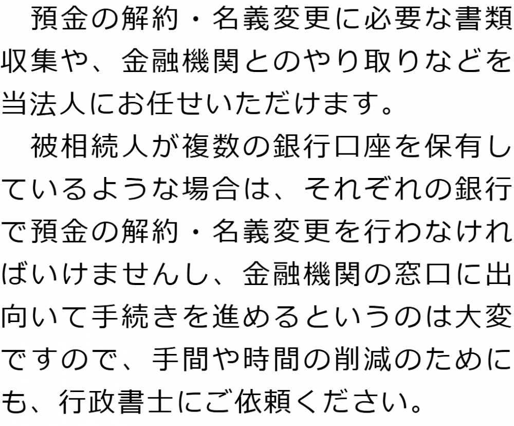 トップ業務内容預金・貯金の解約・名義変更 階層構造▼ 業務内容(目次) 預金・貯金の解約・名義変更 業務内容(目次)業務内容トップ行政書士法人心の業務内容遺言遺産整理相続人調査相続財産調査遺産分割協議書の作成預金・貯金の解約・名義変更証券口座の解約・名義変更自動車の名義変更心グループのその他の業務内容家族信託・民事信託節税対策事業承継遺言の検認相続放棄限定承認遺産分割遺留分侵害額請求相続登記相続税申告相続税調査 受付時間 平日 9時~21時、土日祝 9時~18時 夜間・土日祝の相談も対応します (要予約) 所在地 〒104-0061 東京都中央区銀座1-19-14GINZA ONE BUILDING 8F (旧表記:ホーメスト木箱銀座ビル8F) 0120-2403-39 お問合せ・アクセス・地図