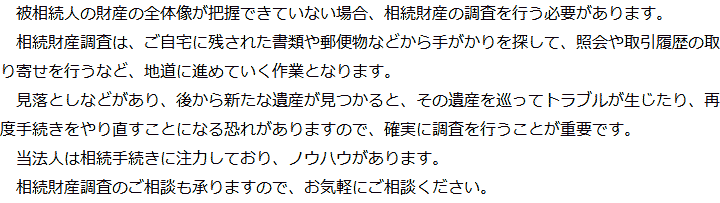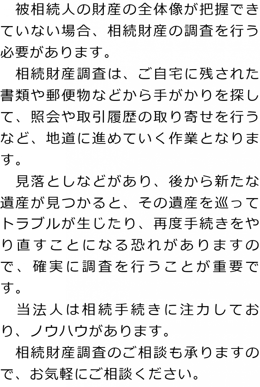 トップ業務内容相続財産調査 階層構造▼ 業務内容(目次) 相続財産調査 業務内容(目次)業務内容トップ行政書士法人心の業務内容遺言遺産整理相続人調査相続財産調査遺産分割協議書の作成預金・貯金の解約・名義変更証券口座の解約・名義変更自動車の名義変更心グループのその他の業務内容家族信託・民事信託節税対策事業承継遺言の検認相続放棄限定承認遺産分割遺留分侵害額請求相続登記相続税申告相続税調査 受付時間 平日 9時~21時、土日祝 9時~18時 夜間・土日祝の相談も対応します (要予約) 所在地 〒104-0061 東京都中央区銀座1-19-14GINZA ONE BUILDING 8F (旧表記:ホーメスト木箱銀座ビル8F) 0120-2403-39 お問合せ・アクセス・地図