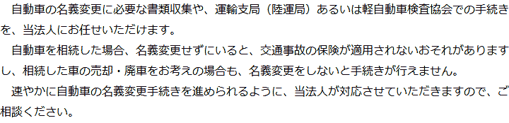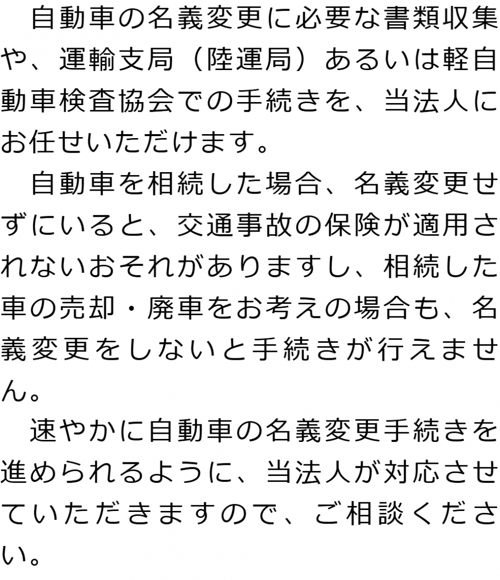 トップ業務内容自動車の名義変更 階層構造▼ 業務内容(目次) 自動車の名義変更 業務内容(目次)業務内容トップ行政書士法人心の業務内容遺言遺産整理相続人調査相続財産調査遺産分割協議書の作成預金・貯金の解約・名義変更証券口座の解約・名義変更自動車の名義変更心グループのその他の業務内容家族信託・民事信託節税対策事業承継遺言の検認相続放棄限定承認遺産分割遺留分侵害額請求相続登記相続税申告相続税調査 受付時間 平日 9時~21時、土日祝 9時~18時 夜間・土日祝の相談も対応します (要予約) 所在地 〒104-0061 東京都中央区銀座1-19-14GINZA ONE BUILDING 8F (旧表記:ホーメスト木箱銀座ビル8F) 0120-2403-39 お問合せ・アクセス・地図