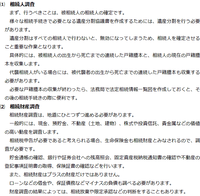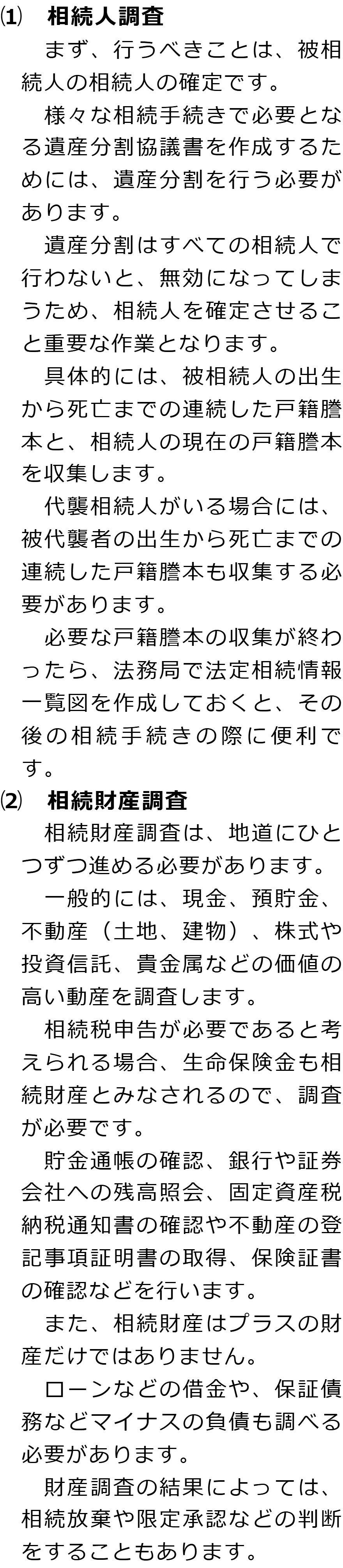 相続手続きの必要事項に関するQ&AQ相続手続きでは何をする必要がありますか?Q相続人調査と相続財産調査では何をする必要がありますか?Q遺産分割では何が必要ですか?Q相続登記はどのような場合に必要ですか?Q相続税申告はどのような場合に必要ですか? Q相続手続きでは何をする必要がありますか?AQ相続人調査と相続財産調査では何をする必要がありますか?AQ遺産分割では何が必要ですか?AQ相続登記はどのような場合に必要ですか?AQ相続税申告はどのような場合に必要ですか?A Q&A(目次)Q&Aトップ相続手続きの必要事項に関するQ&A 受付時間 平日 9時~21時、土日祝 9時~18時 夜間・土日祝の相談も対応します (要予約) 所在地 〒104-0061 東京都中央区銀座1-19-14GINZA ONE BUILDING 8F (旧表記:ホーメスト木箱銀座ビル8F) 0120-2403-39 お問合せ・アクセス・地図