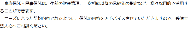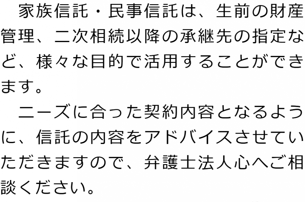 トップ業務内容家族信託・民事信託 階層構造▼ 業務内容(目次) 家族信託・民事信託 業務内容(目次)業務内容トップ行政書士法人心の業務内容遺言遺産整理相続人調査相続財産調査遺産分割協議書の作成預金・貯金の解約・名義変更証券口座の解約・名義変更自動車の名義変更心グループのその他の業務内容家族信託・民事信託節税対策事業承継遺言の検認相続放棄限定承認遺産分割遺留分侵害額請求相続登記相続税申告相続税調査 受付時間 平日 9時~21時、土日祝 9時~18時 夜間・土日祝の相談も対応します (要予約) 所在地 〒104-0061 東京都中央区銀座1-19-14GINZA ONE BUILDING 8F (旧表記:ホーメスト木箱銀座ビル8F) 0120-2403-39 お問合せ・アクセス・地図
