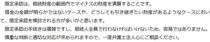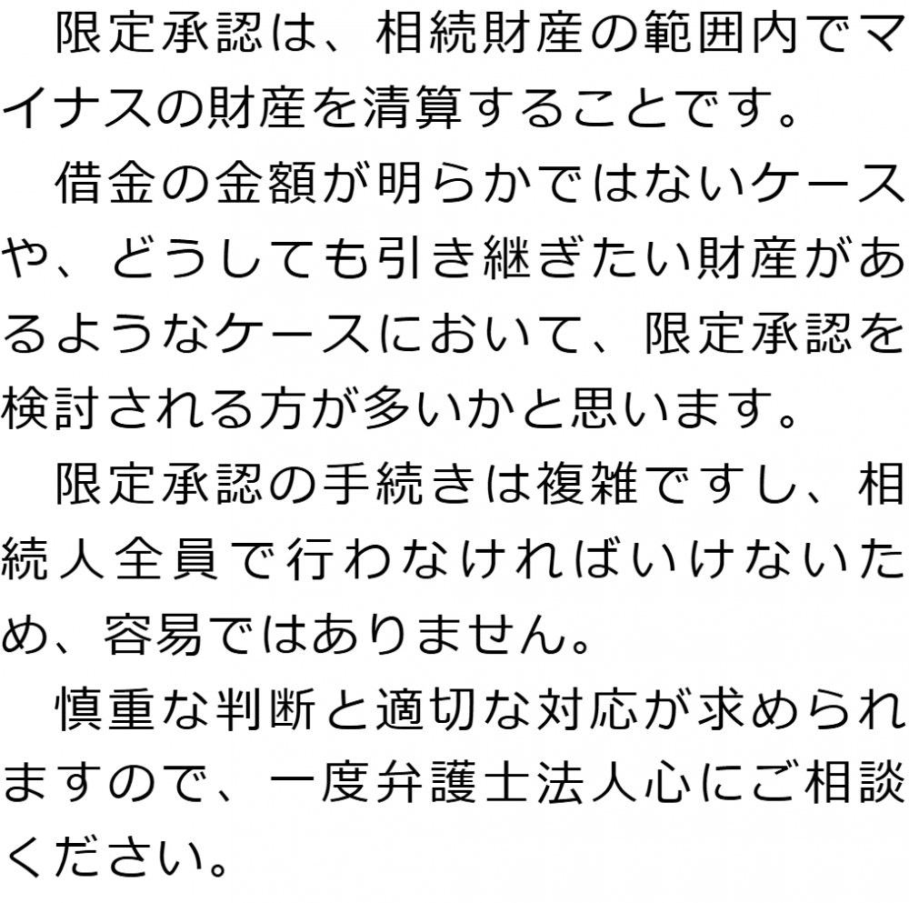 トップ業務内容限定承認 階層構造▼ 業務内容(目次) 限定承認 業務内容(目次)業務内容トップ行政書士法人心の業務内容遺言遺産整理相続人調査相続財産調査遺産分割協議書の作成預金・貯金の解約・名義変更証券口座の解約・名義変更自動車の名義変更心グループのその他の業務内容家族信託・民事信託節税対策事業承継遺言の検認相続放棄限定承認遺産分割遺留分侵害額請求相続登記相続税申告相続税調査 受付時間 平日 9時~21時、土日祝 9時~18時 夜間・土日祝の相談も対応します (要予約) 所在地 〒104-0061 東京都中央区銀座1-19-14GINZA ONE BUILDING 8F (旧表記:ホーメスト木箱銀座ビル8F) 0120-2403-39 お問合せ・アクセス・地図