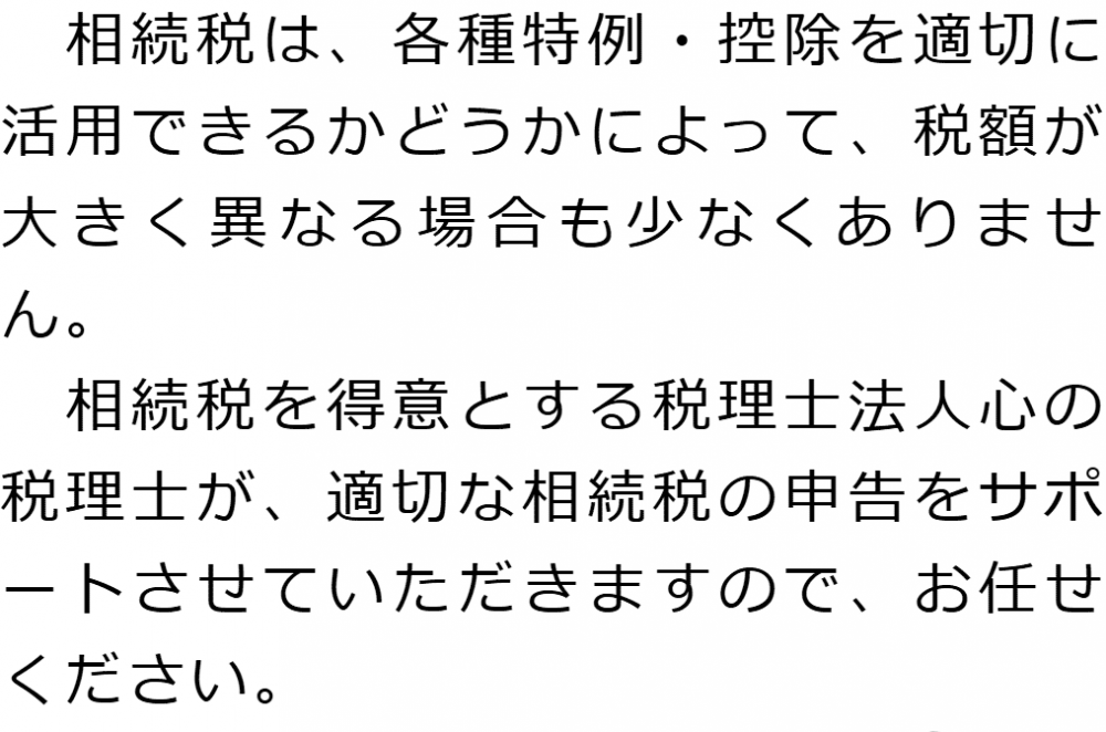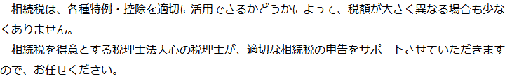 トップ業務内容相続税申告 階層構造▼ 業務内容(目次) 相続税申告 業務内容(目次)業務内容トップ行政書士法人心の業務内容遺言遺産整理相続人調査相続財産調査遺産分割協議書の作成預金・貯金の解約・名義変更証券口座の解約・名義変更自動車の名義変更心グループのその他の業務内容家族信託・民事信託節税対策事業承継遺言の検認相続放棄限定承認遺産分割遺留分侵害額請求相続登記相続税申告相続税調査 受付時間 平日 9時~21時、土日祝 9時~18時 夜間・土日祝の相談も対応します (要予約) 所在地 〒104-0061 東京都中央区銀座1-19-14GINZA ONE BUILDING 8F (旧表記:ホーメスト木箱銀座ビル8F) 0120-2403-39 お問合せ・アクセス・地図